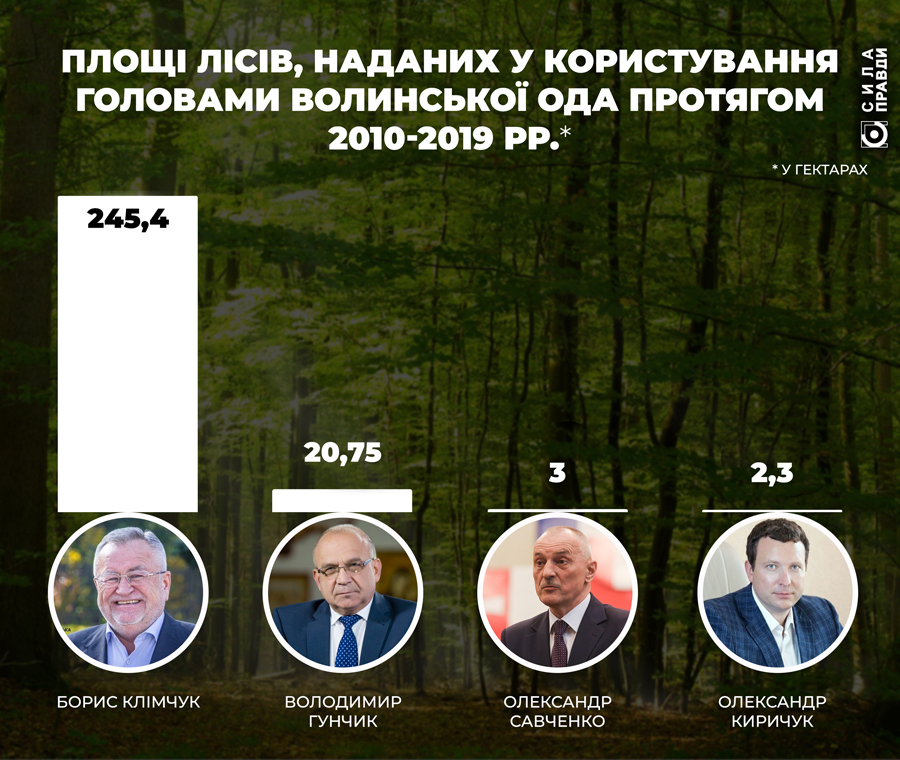 На другому місці – Володимир Гунчик. За час свого керівництва на Волині він підписав 7 розпоряджень, але стосувалися вони 14 об’єктів. На рахунку Олександра Савченка – 2 розпорядження і 2 лісоділянки. З червня до грудня 2019-го, поки на Волині не було призначено голови ОДА, на цю схему спокусився тимчасовий виконувач обов’язків очільника виконавчої влади області Олександр Киричук, виділивши у довготривале користування мисливській фірмі «Веста М» лісову ділянку в загальнозоологічному заказнику «Озерянський» на Турійщині. «Сила правди» вже писала про те, що таким чином власник підприємства волинський депутат і відомий бізнесмен Роман Микитюк намагається легалізувати будівництво рекреаційної бази біля озера «Бережисте».