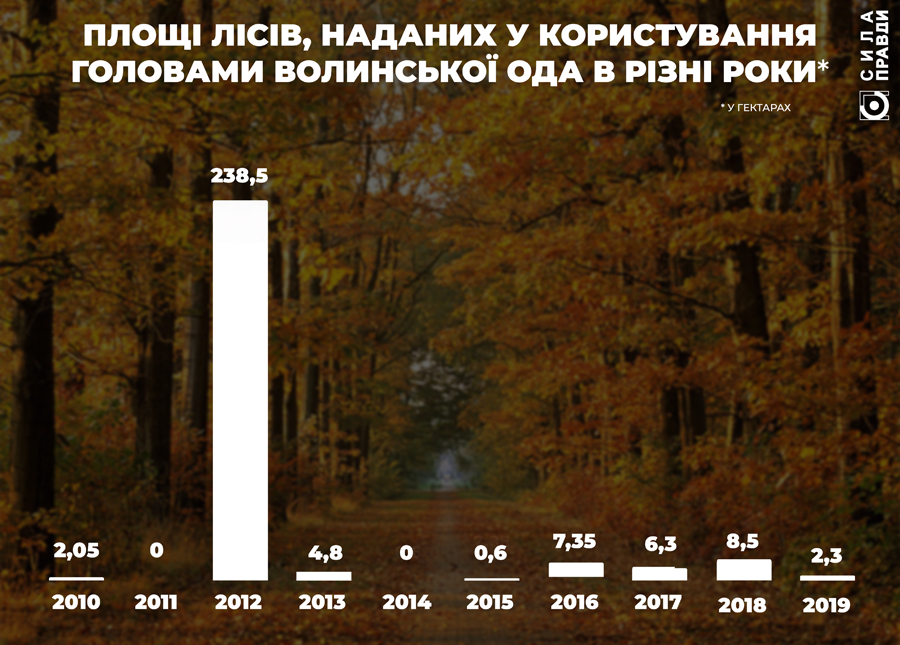 Згідно Реєстру розпоряджень Волинської ОДА, жодної ділянки не віддавалося таким чином протягом 2011-го та 2014-го років. Водночас найщедрішим був 2012-й: 5 розпоряджень і 8 лісових ділянок відійшли в користування приватників. Майже всі на 49 років.