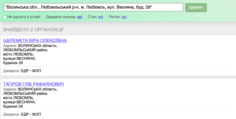 Окрім того, адреса Гліба Тагірова, яку він вказав як засновник, збігається з адресою іншої людини — Віри Шеремети, якій у 2018-ому голова Волинської ОДА Володимир Гунчик також надавав лісову ділянку площею 1,1 га на території Шацького національного природного парку.