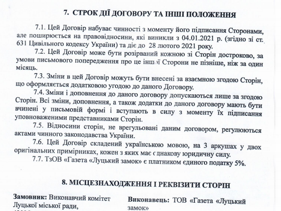 Аналогічна інформація, як у відповідях на запити, є й на сайті Prozorro. У акті здачі-прийнятті робіт, укладеному між Луцькою міською радою та газетою «Луцький замок», за січень 2021 року загальна вартість послуг становить 32 262,80 грн. У акті за лютий 2021 року сума виконаних робіт становить – 17637,20 грн. Тобто за два місяці сума склала 49 900 грн.