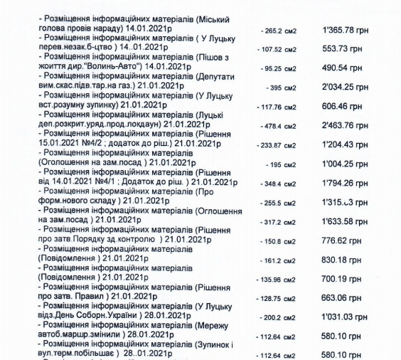 У лютому в газеті «Луцький замок» теж суми були різні за публікації. Наприклад, розміщення інформації в цій газеті про те, що Луцьк отримав чотири нові тролейбуси вартувало 3 079, 70 грн, про вшанування загиблих героїв Крут (4.02.2021 р) – 1 606,80 грн. Ще один договір на суму 40830 гривень укладений між Луцькою міською радою та ТРК «Аверс». Відповідно до угоди, за ці гроші передбачені на підготовку та трансляцію чотирьох програм «Відкрита влада. Місто». Інформація про це також є на сайті Prozorro.