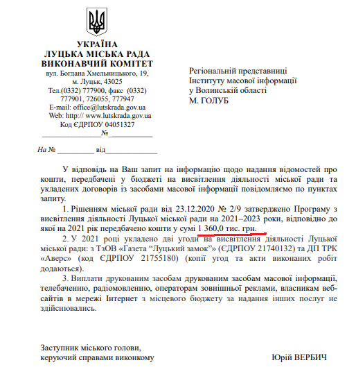 В управлінні інформполітики та цифрової трансформації Волинської ОДА у відповіді на запит зазначили, що в бюджеті на 2021 рік не визначено витрати на висвітлення діяльності посадових осіб Волинської ОДА. Відповідно, договори щодо висвітлення діяльності Волинської ОДА та посадових осіб наразі не укладено. Також у цьому році не здійснювалися виплати друкованим засобам масової інформації, телебаченню, радіомовленню, операторам зовнішньої реклами, власникам веб-сайтів в мережі Інтернет (крім офіційного веб-сайту обласної державної адміністрації ради) за надання інших послуг Волинській обласній державній адміністрації.