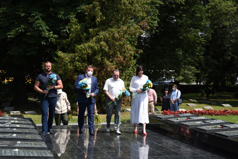 Одразу п'ять з семи людей в шерензі до покладання квітів до пам'ятного стенду Героїв Небесної Сотні та загиблих воїнів АТО – представники міськради: в.о міського голови, три заступники та радник. Це та інші фото відділу інформаційної роботи Луцькради