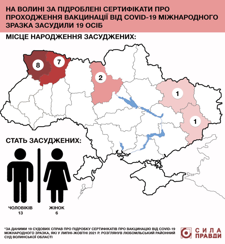 24 лютого 2021 року в Україні зробили перше щеплення від Covid-19. Документи, які засвідчують курс профілактики від небезпечної хвороби, почали видавати з 1 липня. З того часу волинські суди винесли 19 вироків у справах про підробку сертифікатів про вакцинацію від Covid-19 міжнародного зразка. Усі вони відносно громадян, які спершу придбали завідомо підроблені документи, а потім намагались використати їх під час перетину державного кордону. Поки – жодного вироку відносно осіб, які їх видали. Усі ці справи розглядав Любомльський районний суд. Саме тут розглядають більшість місцевих справ про порушення на кордоні з Польщею, оскільки митний пост «Ягодин» розташований саме у колишньому Любомльському районі.