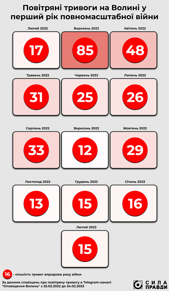 За даними Telegram-каналу «Оповіщення Волинь», в якому інформують про повітряну тривогу в регіоні, з 25 лютого 2022 року до 24 лютого 2023 року волиняни мали спускатися в укриття 365 разів. В середньому – майже раз на добу. Однак, інтенсивність атак ворога ракетами, загрози з повітря, а відповідно і кількість повітряних тривог, впродовж року була нерівномірна. Наприклад, у перший місяць тривоги лунали в середньому майже тричі на добу, впродовж другого місяця – двічі на добу, далі інтенсивність поволі зменшувалася.