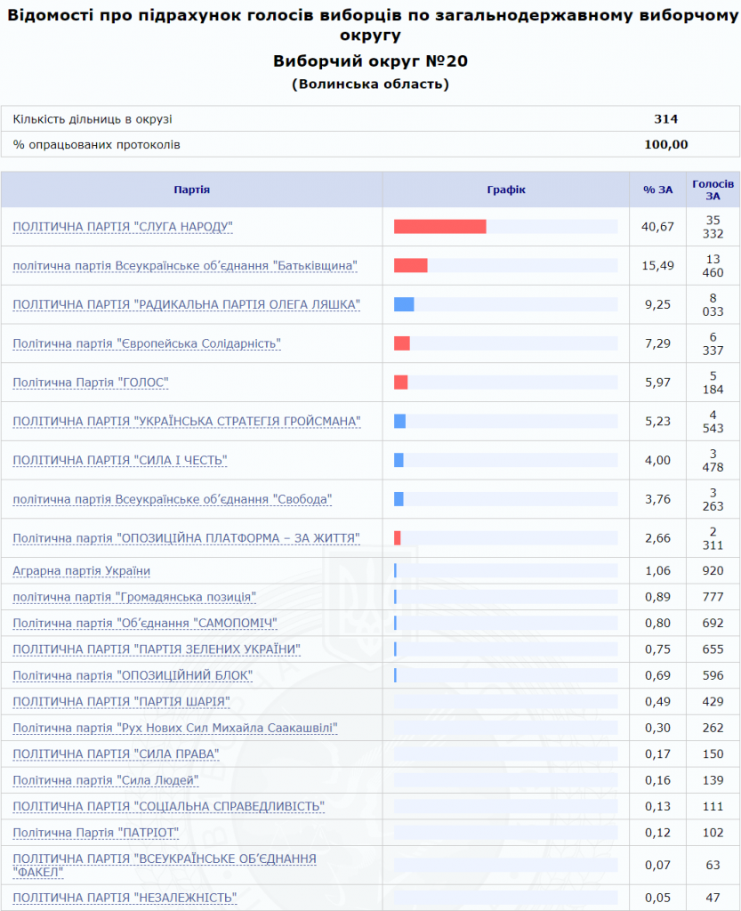 Виборці Горохівського, Локачинського, Луцького, Рожищенського та Турійського районів, які прийшли на дільниці, віддали партії «Слуга народу» 40,67% голосів. На другому місці опинилась політична партія «Всеукраїнське об’єднання «Батьківщина» з 15,49% голосів. Замикає трійку лідерів «Радикальна партія Олега Ляшка», яку хотіли б бачити у Верховній Раді 9,25% виборців 20-го округу. 7,29% голосів дісталось «Європейській Солідарності», 5,97% – партії «Голос» і 5,23% – «Українській стратегії Гройсмана». Інші політичні сили здобули меншу підтримку.
