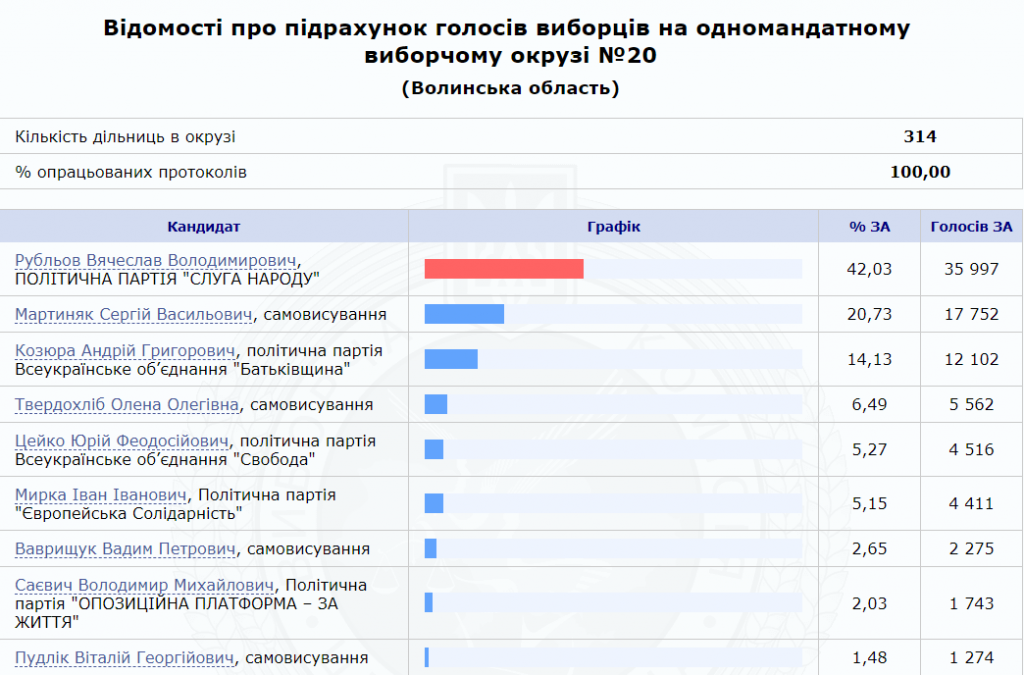 Серед кандидатів в нардепи в одномандатному окрузі найбільше голосів отримав висуванець партії «Слуга народу» В’ячеслав Рубльов – 42,03%. Чинний нардеп-самовисуванець Сергій Мартиняк здобув на половину меншу підтримку – 20,73%. За ним з результатом 14,13% опинився висуванець «Батьківщини» Андрій Козюра. 6,49% виборців підтримали голову Княгининівської об’єднаної територіальної громади Олену Твердохліб, 5,27% – свободівця Юрія Цейка, ще 5,15% – висуванця «Європейської Солідарності» Івана Мирку.