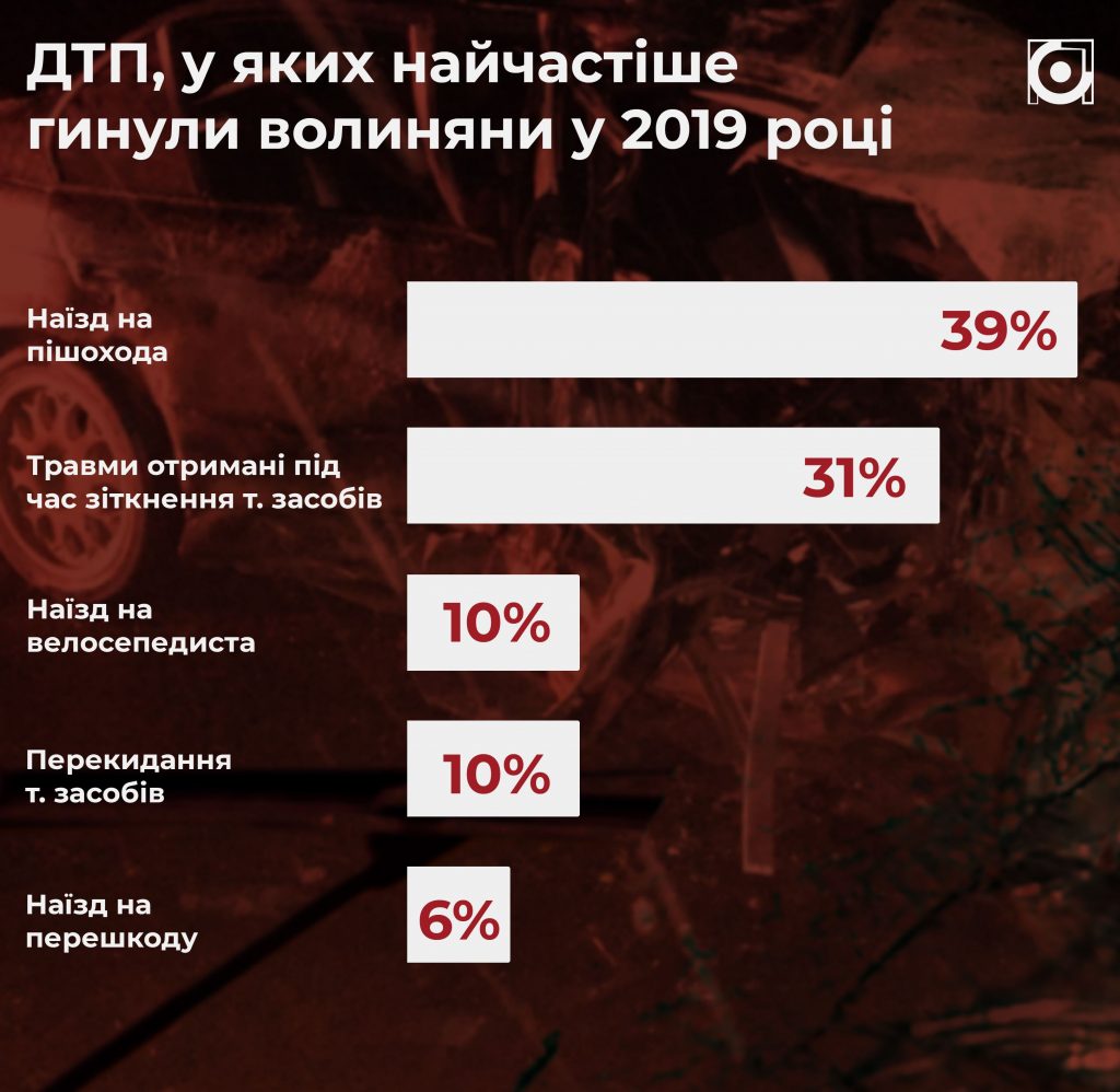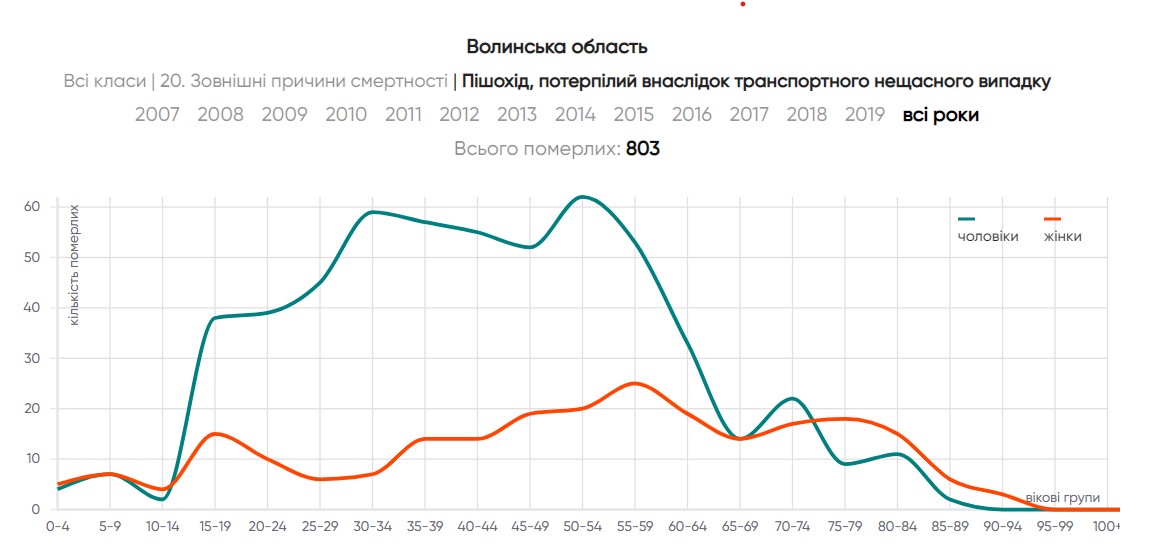 Згідно з даними, які «Сила правди» отримала від управління статистики у Волинській області з 2007 по 2019 рік, на Волині у ДТП частіше гинули пішоходи, ніж водії транспортних засобів. За ці 13 років в області зафіксували 803 таких смерті.