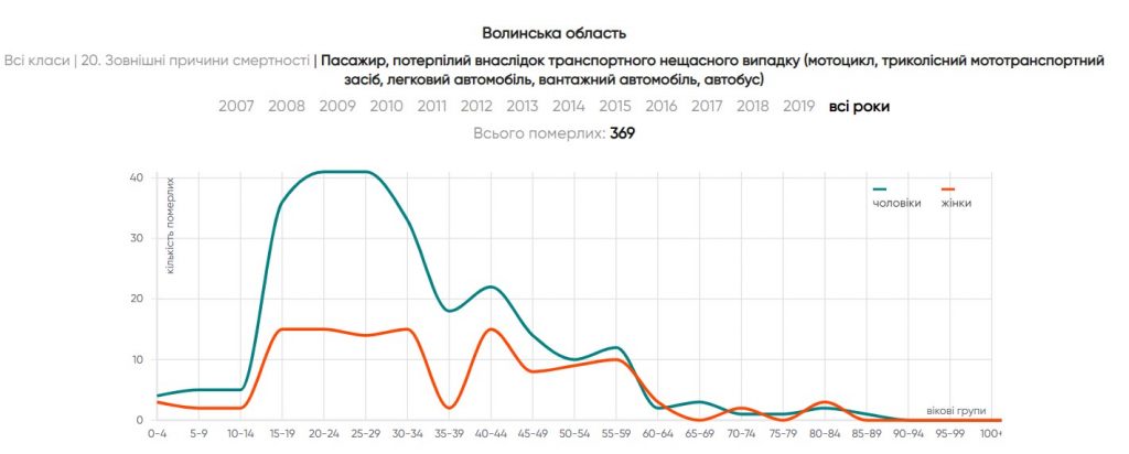 Понад 40 загиблих чоловіків (11%), які стали учасниками аварій на Волині, були у віці від 20 до 29 років, понад 20 (5,5%) – у віці 40-44 роки, понад десять – у віці 55-59 років. Близько 15-ти жінок загинули у віці 15-34 роки, така ж кількість у віці – 40-44 роки.