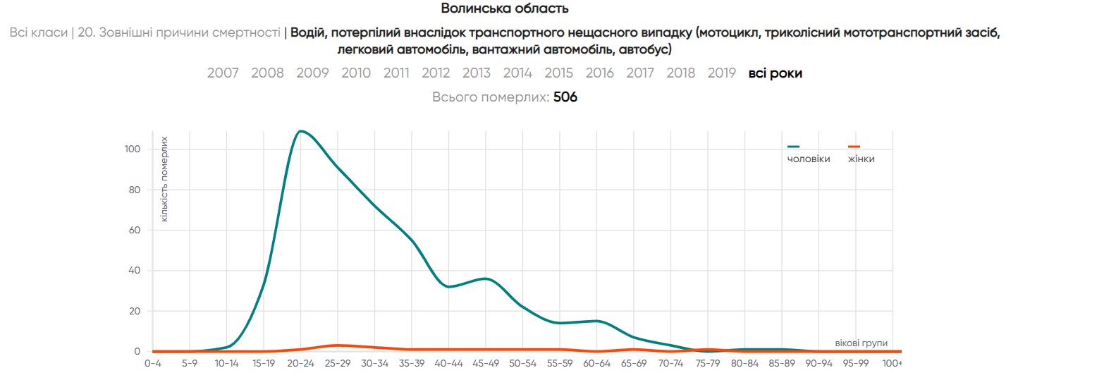 Загалом же по області із загиблих в ДТП водіїв лише 2,5% – жінки, усе решта – чоловіки. За віковою структурою понад 100 загиблих чоловіків (20%) були у віці 20-24 роки.