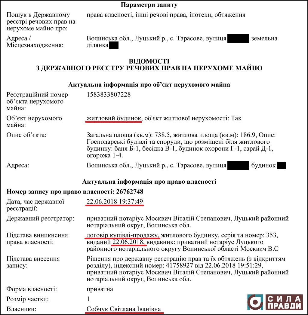 За два тижні після цього маєток в Тарасовому Ольга Лазорко нібито продає… сестрі Олександра Лазорка Світлані Собчук. Така інформація міститься в Державному реєстрі речових прав на нерухоме майно. Таким чином маєток убезпечили від наступних можливих арештів.