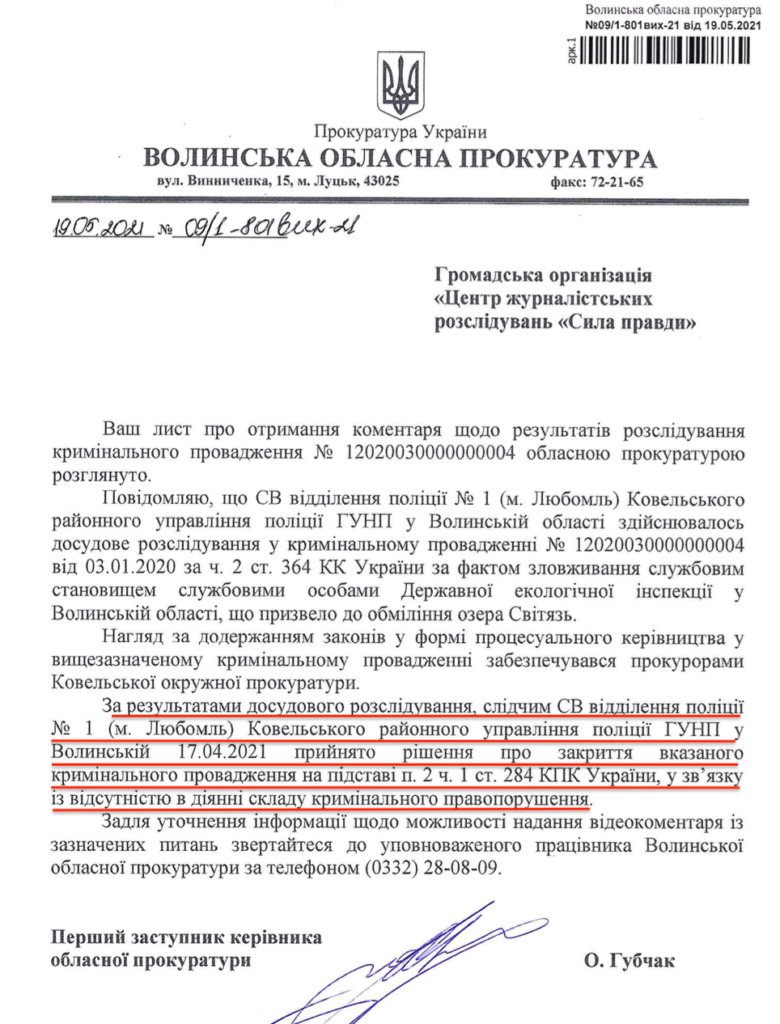 У травні «Сила правди» звернулася до Волинської прокуратури з проханням прокоментувати хід розслідування. У відомстві відмовили. Натомість надіслали лист про те, що справу закрили 17 квітня цього року. Таке рішення прийняв слідчий відділення №1 у місті Любомлі. У зв’язку з відсутністю в діянні складу кримінального правопорушення.