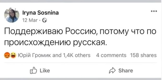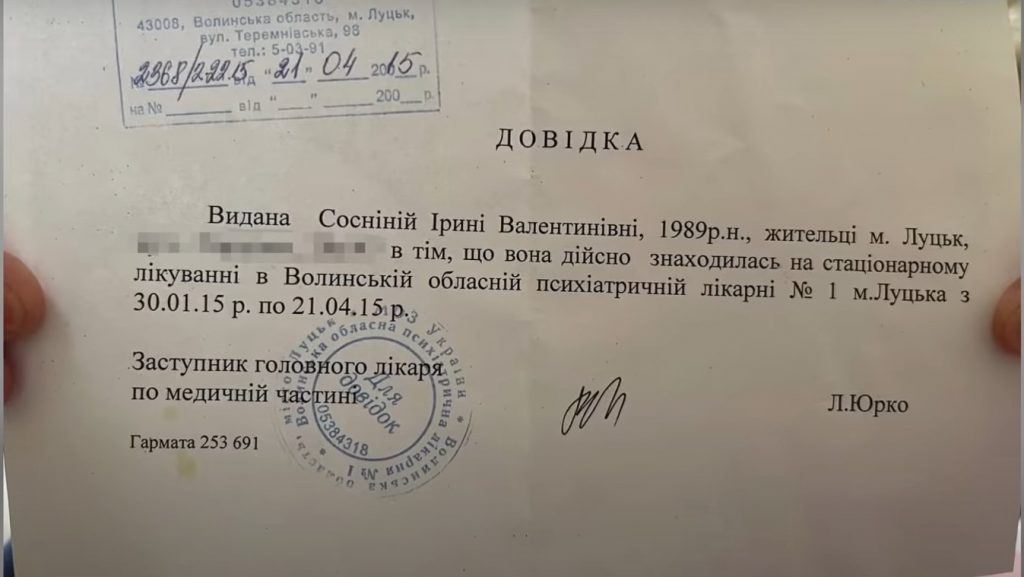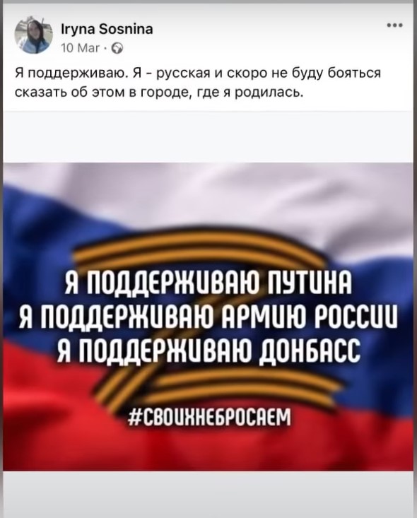 Як стало відомо із власних джерел Центру журналістських розслідувань «Сила правди» мова йде про Ірину Сосніну. Вона неодноразово підтримувала росію в соцмережах. Також жінка проходила психіатричну експертизу. Тричі лікувалася в спеціальних медичних закладах.