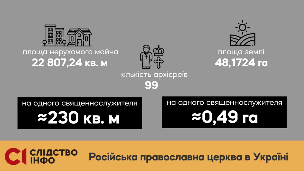 Журналісти також вирахували, скільки в середньому припадає землі та нерухомості на одного представника вищого духовенства трьох найвпливовіших в Україні церков. Так, один єпископ РПЦ в Україні в середньому володіє 230 квадратами нерухомості, УГКЦ — понад 190 квадратами, ПЦУ — майже 114 квадратами. Щодо землі, то єпископи РПЦ в Україні та ПЦУ в середньому мають по пів гектара землі. Єпископ УГКЦ — вдвічі менше.