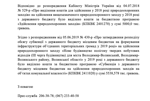 А от Міністерство енергетики та захисту довкілля повідомило, що протягом 2018-2019 років на володимирський полігон спрямували 10 538 578 гривень.