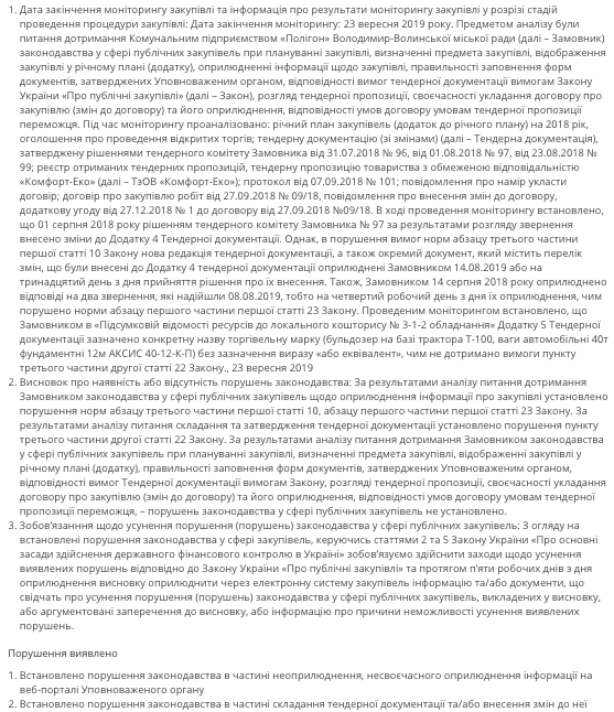 Що ж до відсутності слів «еквівалент» в умовах тендеру, то тут порушники схитрували, вказавши, що закупляли комплекс послуг з будівництва полігону, а не придбавали техніку та обладнання. А тому відповідальність за таке порушення на них не поширюється. Схоже, ця відповідь аудиторів теж влаштувала.