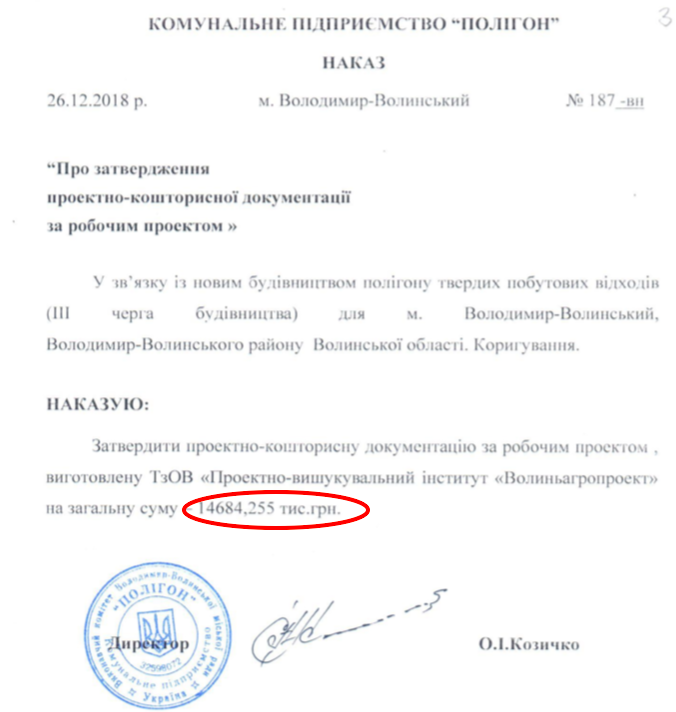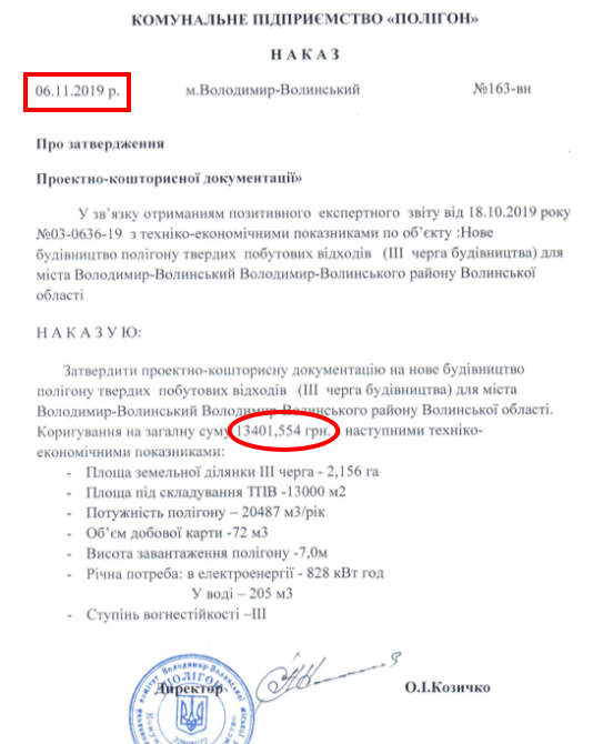 26 грудня директор КП «Полігон» Олександр Козичко підписує наказ, яким затверджує нову кошторисну вартість проєкту на рівні 14 мільйонів 684 тисячі гривень.