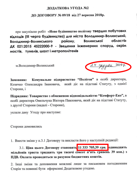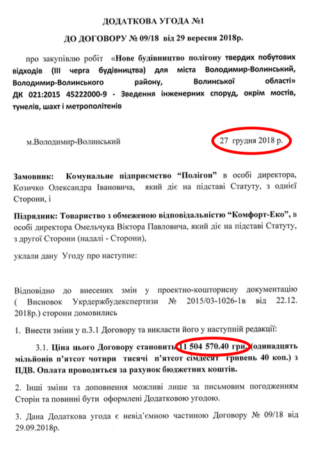 Натомість, наступного дня, 27 грудня 2018-го, КП «Полігон» укладає додаткову угоду до договору з підрядником ТОВ «Комфорт-Еко», якою навпаки зменшує вартість предмета закупівлі до 11 мільйонів 504 тисяч гривень.