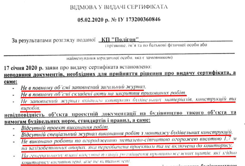 А 5 лютого цього року КП «Полігон» отримало відмову від ДАБІ України у видачі сертифіката на готовність об’єкта до експлуатації.