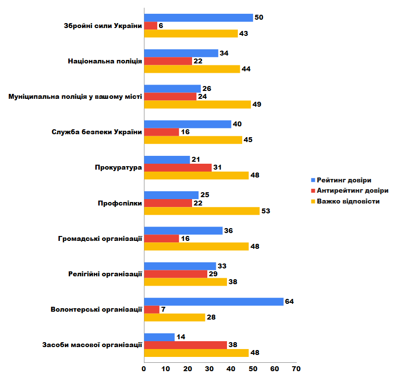 Антирейтинг довіри виглядає наступним чином: 38% опитаних не довіряють ЗМІ, 31% – прокуратурі, 29% – релігійним організаціям, 24% – муніципальній поліції у вашому місті, 22% – національній поліції і профспілкам, 16% – громадським організаціям і СБУ, 7% – волонтерським організаціям, і 6% – ЗСУ.