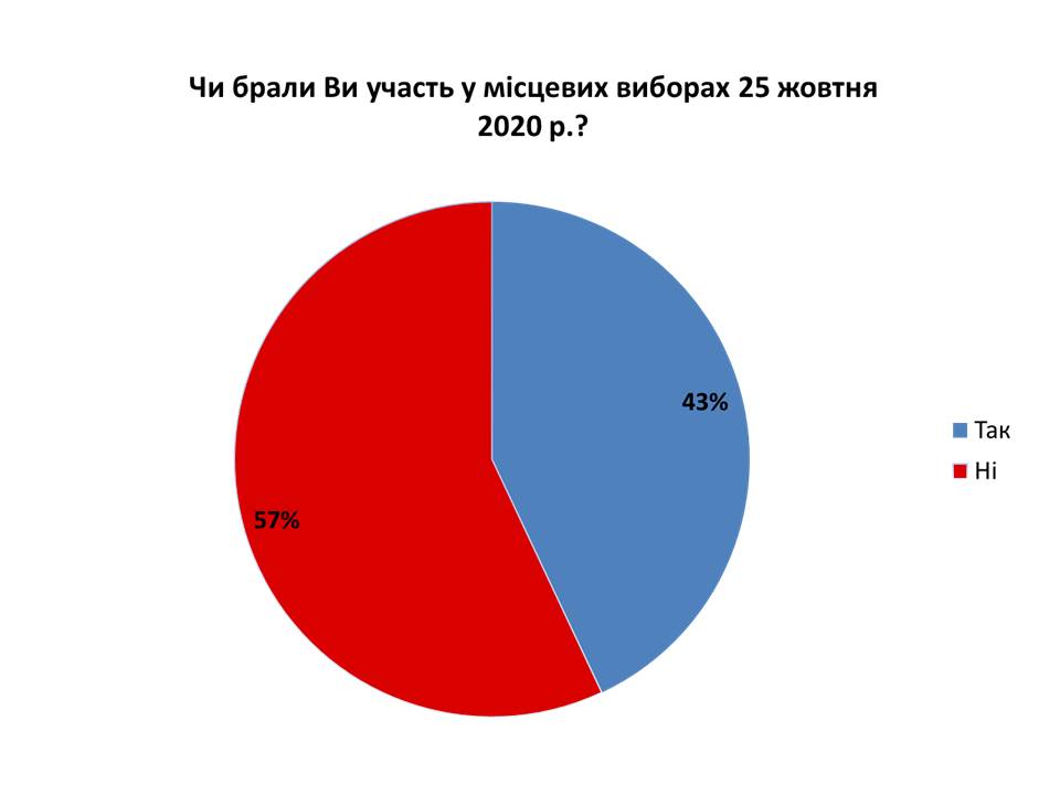 57 % респондентів не брали участь у місцевих виборах 25 жовтня 2020 р., а 43 % зазначили, що голосували. Цей показник участі університетської молоді лише на 1% вищий за явку по Волині (42%) і по Україні (37%) за даними ЦВК України.