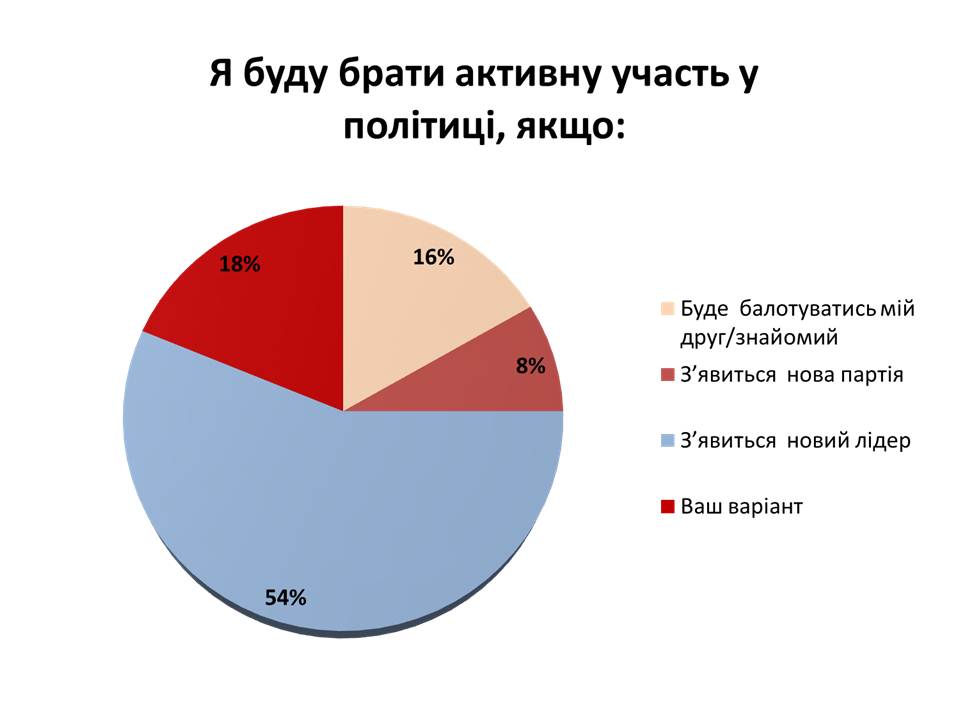 Щодо перспектив активної участі у політиці, то 57% зазначили, що будуть брати активну участь у політичному житті, якщо з’явиться новий лідер, 16% – буде балотуватися друг/знайомий, і 8% – з’явиться нова партія.