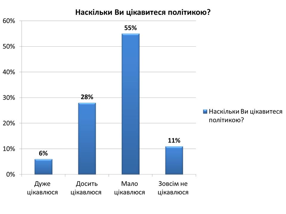 Політична культура студентської молоді низька і це становить загрозу для майбутнього демократичного розвитку України, бо є чудовим ґрунтом для популістських та/або диктаторських режимів. Лише 34% опитаних цікавляться політикою, хоча цей відсоток може стати агентами змін. У молоді є нерозуміння впливу наслідків політичної діяльності на якість життя кожного громадянина.