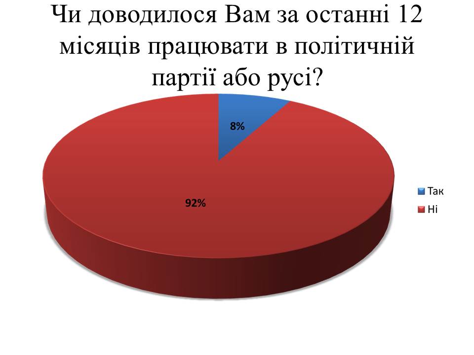 Більшість опитуваних (92%) зазначили, що їм не доводилося працювати за останні 12 місяців в політичній партії або русі, і лише 8% відповіли ствердно.