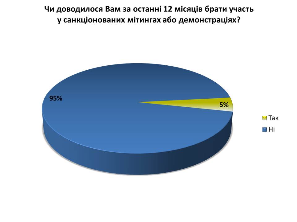 Тільки 5% респондентів за останні 12 місяців брали участь у санкціонованих мітингах або демонстраціях, і 95% опитуваних не брали участі у таких заходах.