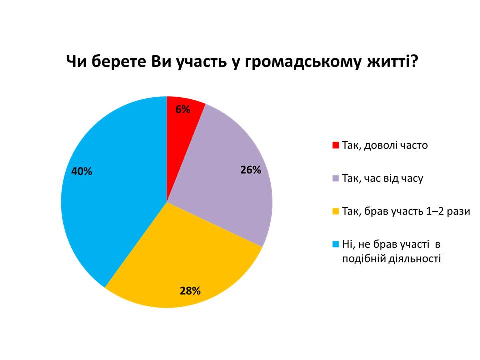 40% опитаних зазначили, що не брали участі у громадському житті, 28% – брали участь 1-2 рази, 26% – брали участь час від часу, і лише 6% молоді доволі часто брали участь у громадському житті.