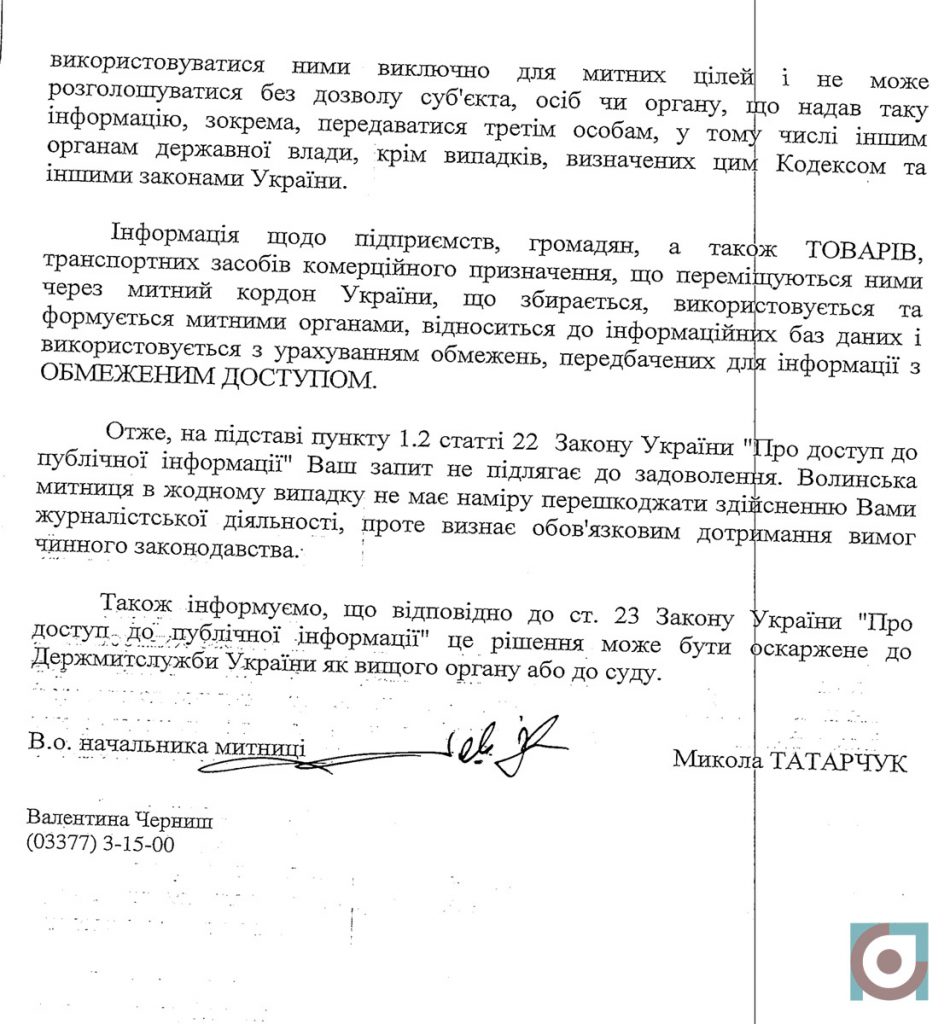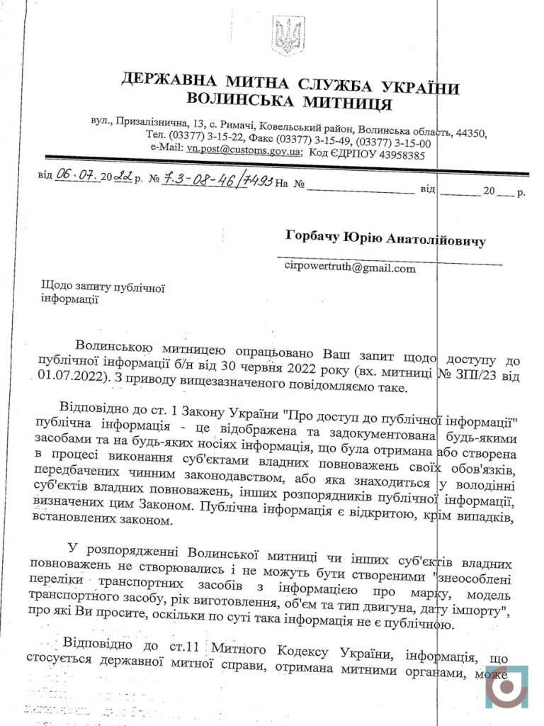 Однак, у Волинській митниці відмовили у наданні такої інформації. Хоча приблизно в час відмови на запит на початку липня начальник Волинської митниці Микола Татарчук самостійно також частково озвучив деякі статистичні дані стосовно так званого «нульового розмитнення».