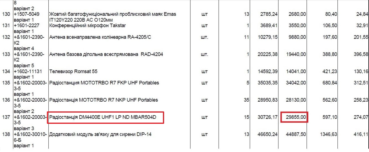 Крім того, луцька система оповіщення буде включати 55 радіостанцій Motorola. З них 15 радіостанцій DM 4400E врахували по ціні 35 826 гривень за одиницю (з ПДВ). Водночас в мережі Інтернет такі ж радіостанції, що мають ідентичну назву і класифікацію, пропонують по 29 760 гривень за одиницю, тобто на шість тисяч гривень дешевше.