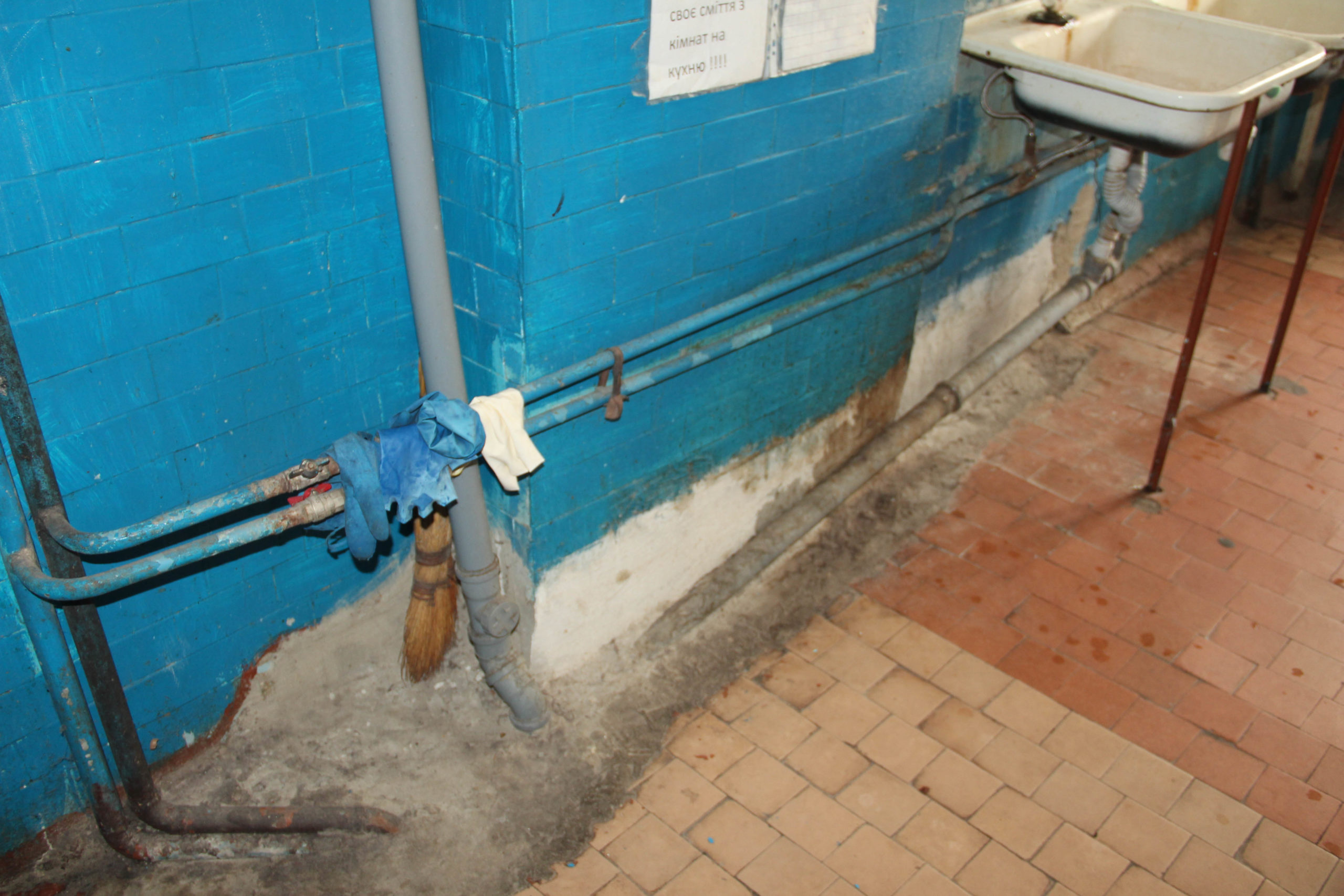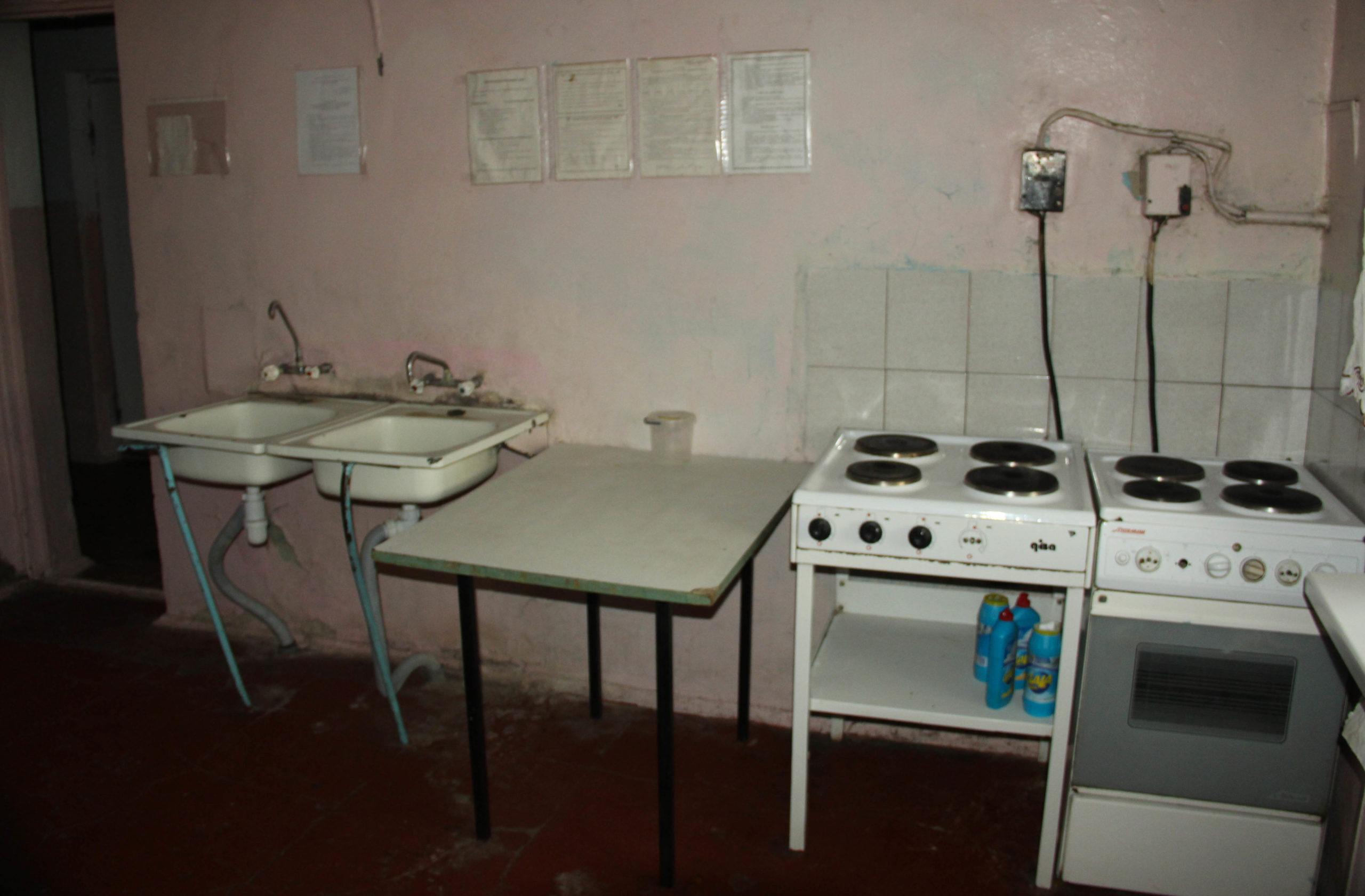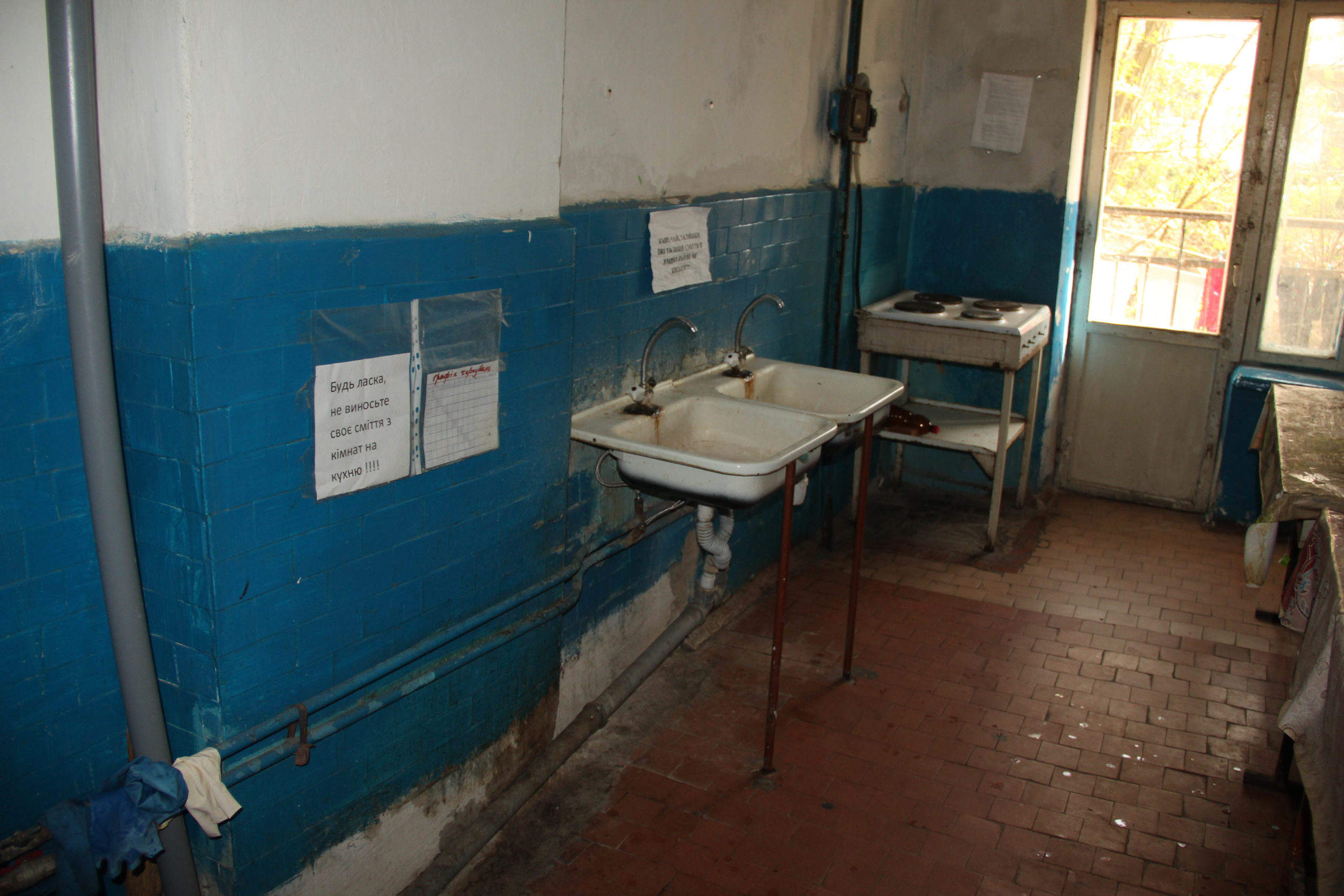 В коридорах переважно темно, тож між кімнатами доводиться рухатись майже наосліп. На цілий поверх одна кухня лише з однією плитою, столом та раковинами. Тут же ненадійну сантехніку видає стійкий неприємний запах.