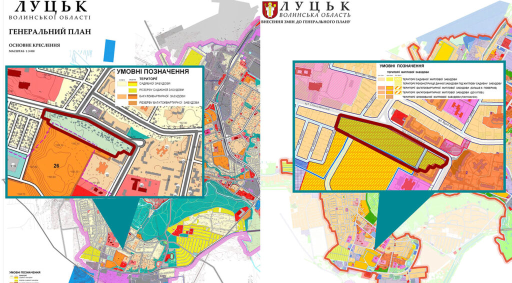 Одна з ділянок – 93 сотки, яку замовниця детального плану Лариса Бондар купила під будівництво та обслуговування житлових будинків, зображена на генеральному плані Луцька, як частина мікрорайону ЛПЗ. А на детальному плані території, який в кінці минулого року затвердили в Луцькій міській раді – це вже село Рованці.