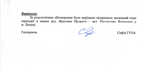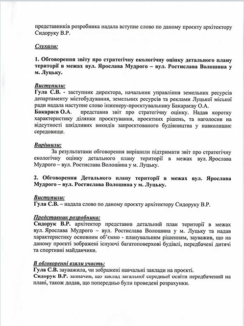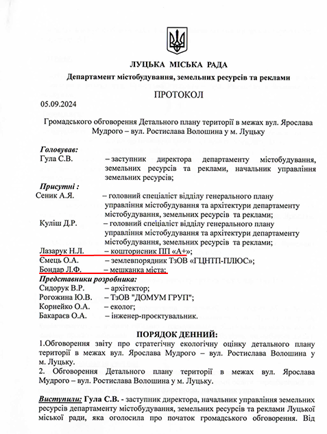 Згідно з документами, громадські слухання відбулися 5-го вересня 2024 року. Щоправда, єдиною представницею містян на обговоренні була сама Лариса Бондар. Звісно ж вона не могла бути проти забудови, яку сама ж запланувала.