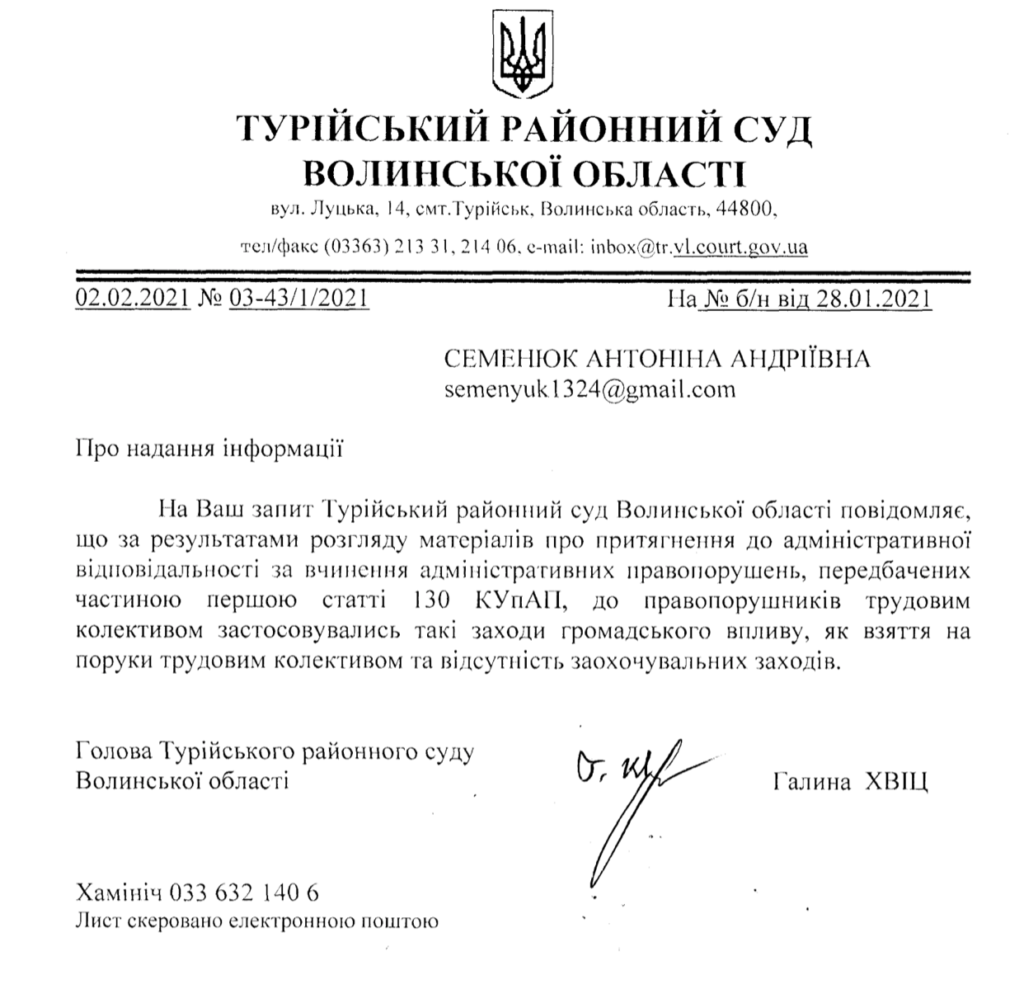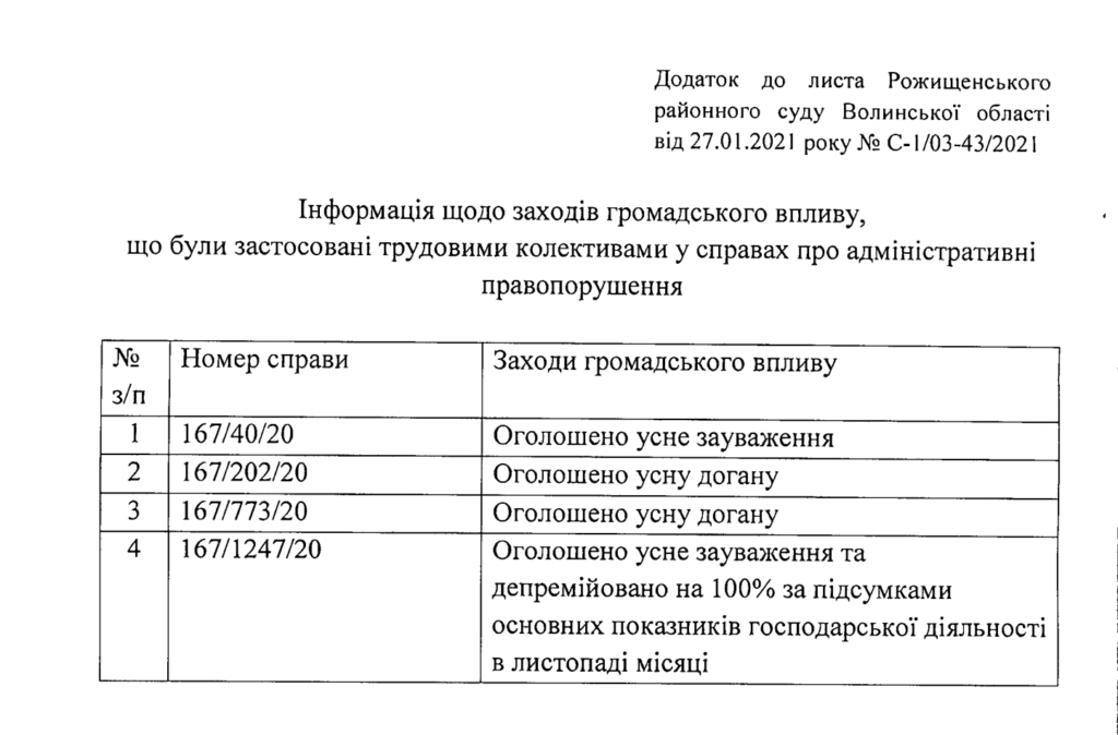 До слова, стежити за тим, як трудові колективи покарали порушників, теж має суд. Відтак «Сила правди» надіслала запити у кілька судів, де приймали подібні рішення.