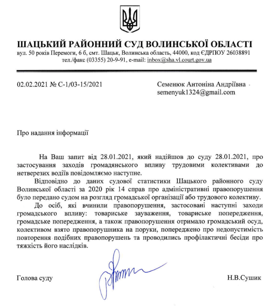 Поодинокі випадки такої взаємодії між судом і правоохоронними органами «Силі правди» вдалося відшукати на Волині. Наприклад, голова Шацького районного суду Наталія Сушик, розглядаючи справу про нетверезе водіння, вирішила передати матеріали Шепетівській місцевій прокуратурі Хмельницької області для притягнення порушника до кримінальної відповідальності. Але це не стало звичною практикою для служителів Феміди. Та ж Наталія Сушик в інших справах просто закривала адмінпровадження.