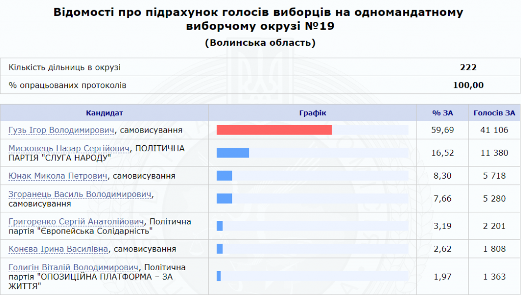 Обираючи депутата на одномандатному 19-му окрузі, виборці продемонстрували ще більшу одностайність. Самовисуванця Ігоря Гузя, який вже був депутатом у попередньому скликанні, підтримали 59,69% виборців. Ще 16,52% голосів дісталось представникові «Слуги народу» Назарові Мисковцю. 8,30% та 7,66% виборців округу підтримали самовисуванців Миколу Юнака і Василя Згоранця відповідно.
