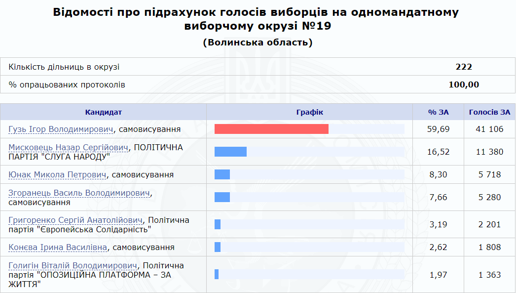 На 19-му окрузі більшість голосів зібрали «Слуга народу» та Ігор Гузь. Такими стали результати голосування у Володимир-Волинському, Іваничівському та Любомльському районах.