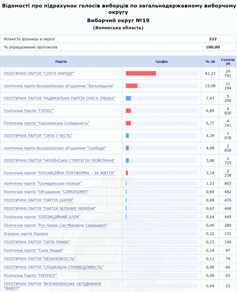 Партія «Слуга народу» перемогла на окрузі з результатом 42,23%. На решті волинських округів більшість також підтримала саме цю політичну силу. Менше виборців, 15,98%, проголосували за «Батьківщину». На третьому місці з показником 7,43% опинилась «Радикальна партія Олега Ляшка». Четвертим став «Голос» – 6,89%. Замкнула п’ятірку «Європейська солідарність», здобувши прихильність 6,77% виборців.