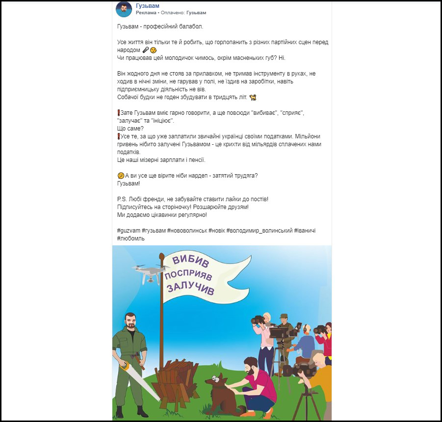 Наприкінці червня у соцмережі створили сторінку «Гузьвам», яка висвітлювала головного фаворита виборів у 19 виборчому окрузі Ігоря Гузя в негативному світлі. Не враховуючи виробництва контенту, лише на просування цієї «чорнухи» хтось витратив 444 долари США.