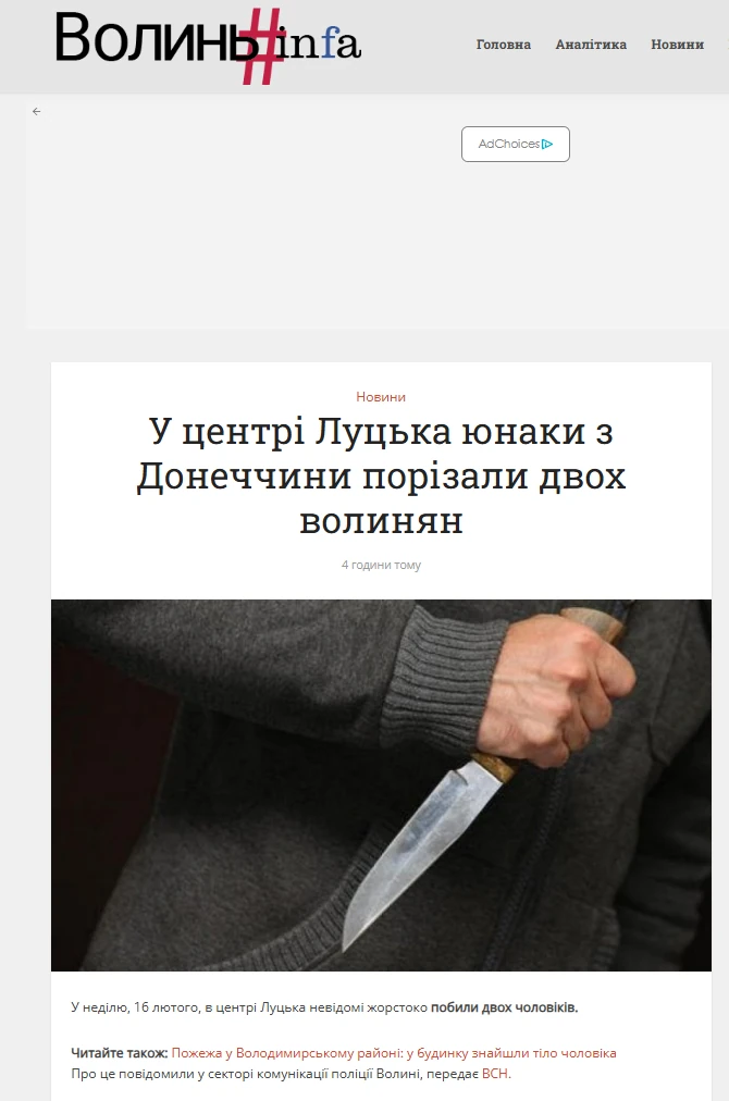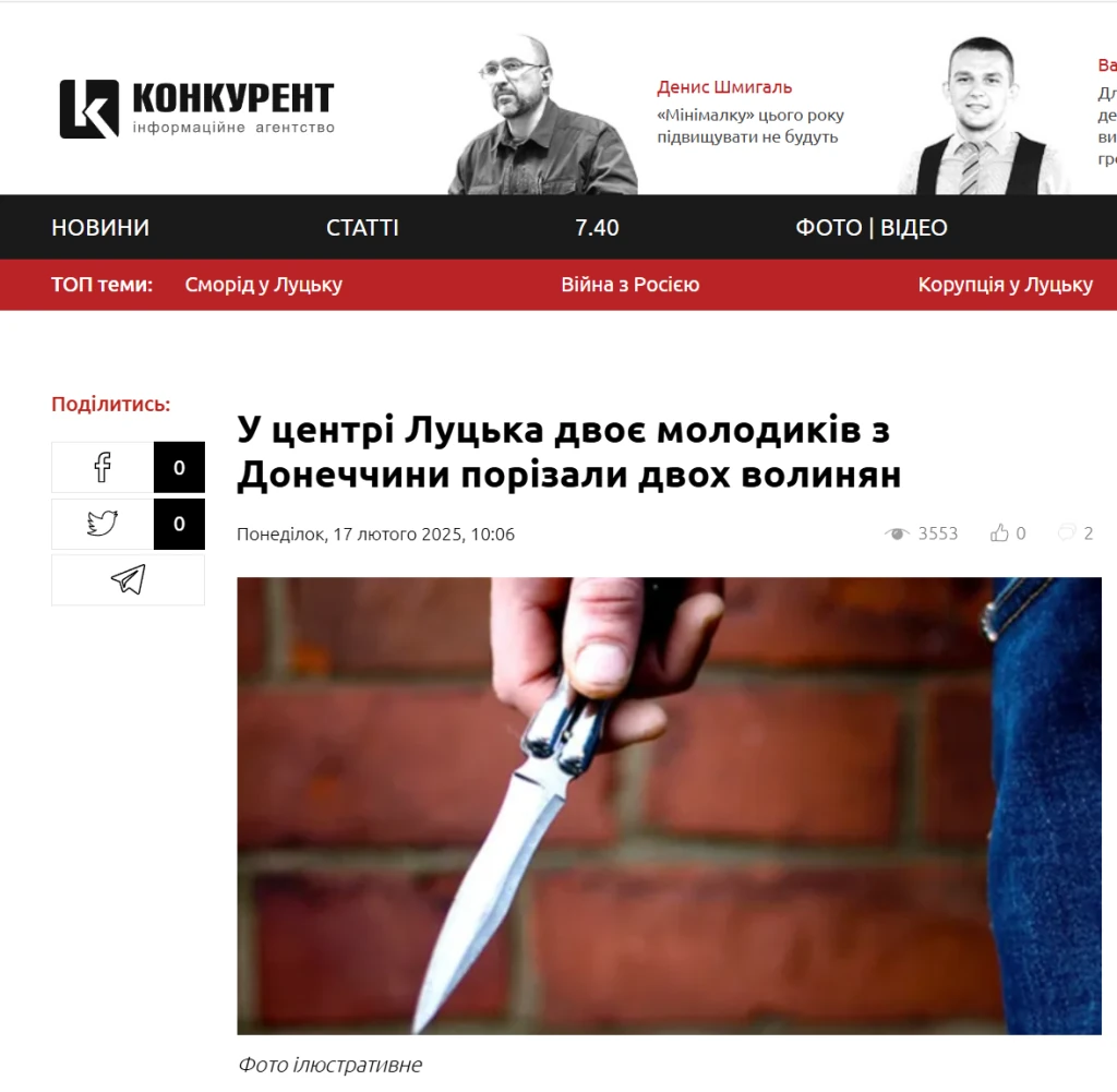 Новина зі схожим заголовком «У центрі Луцька двоє молодиків з Донеччини порізали двох волинян» вийшла і на сайті «Конкурент».
