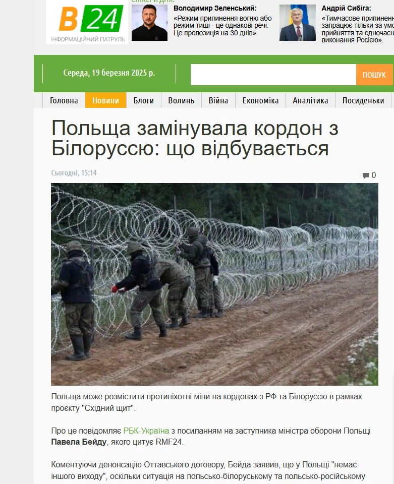 На сайті «Волинь24» у новині за 19 березня «Польща замінувала кордон з Білоруссю: що відбувається» заголовок взагалі не відповідає змісту. У назві стверджується як факт, що міни вже розміщені, втім, в тексті новини йдеться про можливість того, що Польща може розмістити протипіхотні міни на кордонах з РФ та Білоруссю в рамках проєкту «Східний щит».