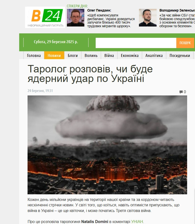 Приклад новини, що може посилити страх чи невпевненість у завтрашньому дні «Таролог розповів, чи буде ядерний удар по Україні», розміщений на сайті «Волинь24». У новині є питання не лише до апокаліптичного заголовку, а й до вибору експерта, у цьому випадку – псевдо. Очевидно, що про війну варто питати військових експертів, а не тарологів. Також у новини є знецінення пережитого українцями під час війни.