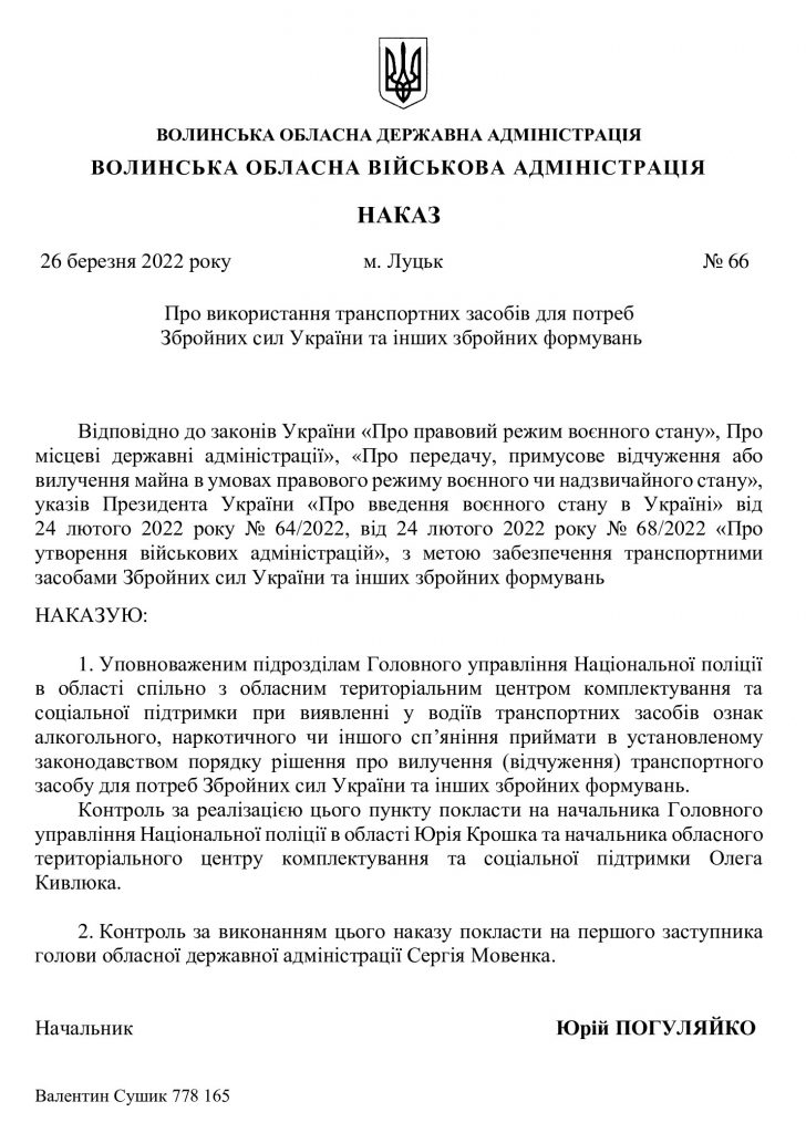 Розпорядження про вилучення автівок для фронту голова Волинської військової адміністрації підписав через місяць після повномасштабного вторгнення росії – 26 березня. У ньому він зобов’язав підрозділи Національної поліції та Центру комплектування та соціальної підтримки приймати рішення про вилучення авто у водіїв, які мають ознаки сп’яніння і передавати ці автівки для ЗСУ.