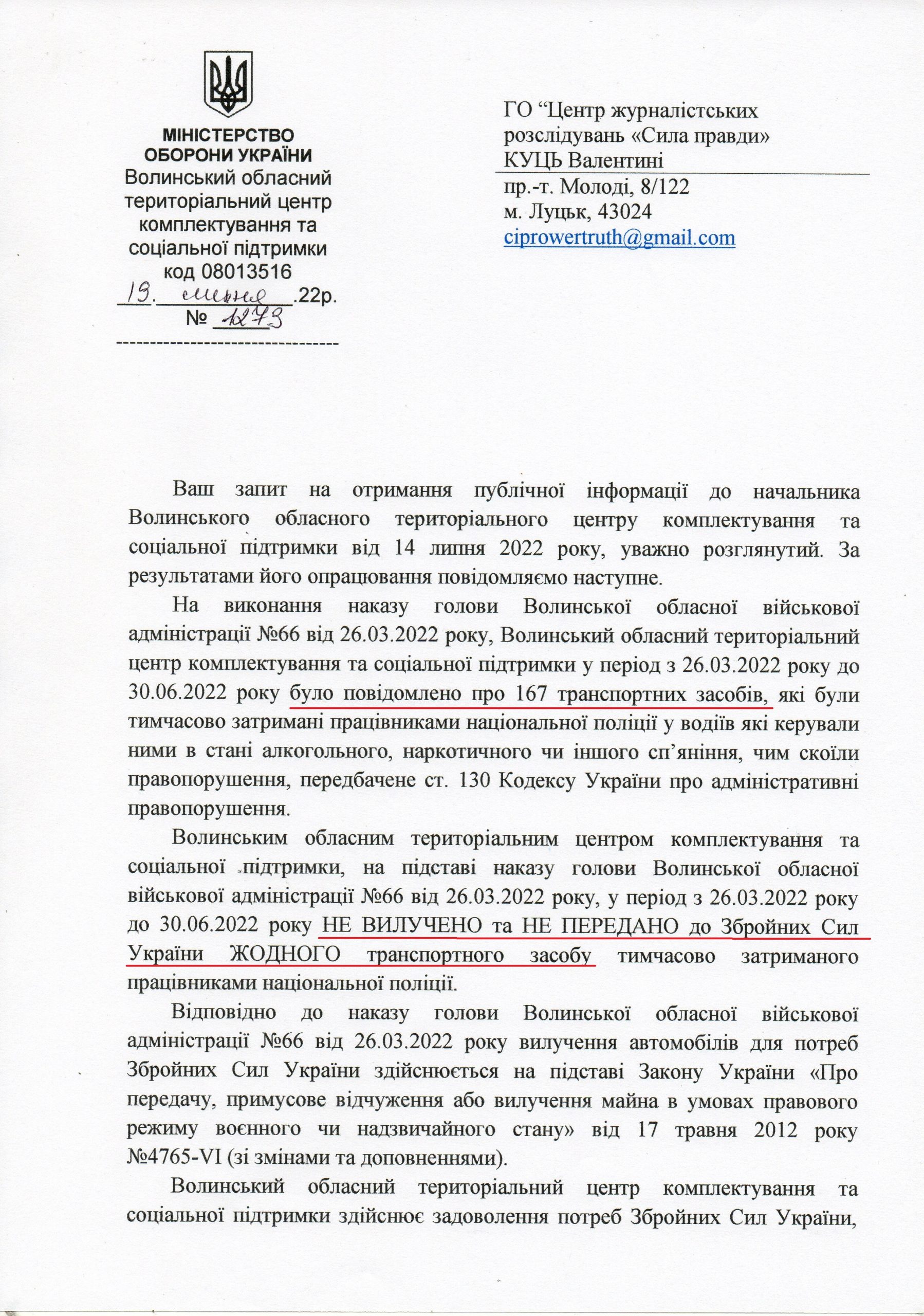 Виявилося, що від моменту прийняття розпорядження голови ОВА про вилучення авто (тобто впродовж 26 березня – 30 червня), Волинський обласний центр комплектації та соціальної підтримки повідомили про 167 автомобілів, які були тимчасово затримані працівниками поліції. Втім, для ЗСУ не передано жодного автомобіля – йдеться у відповіді Центру.