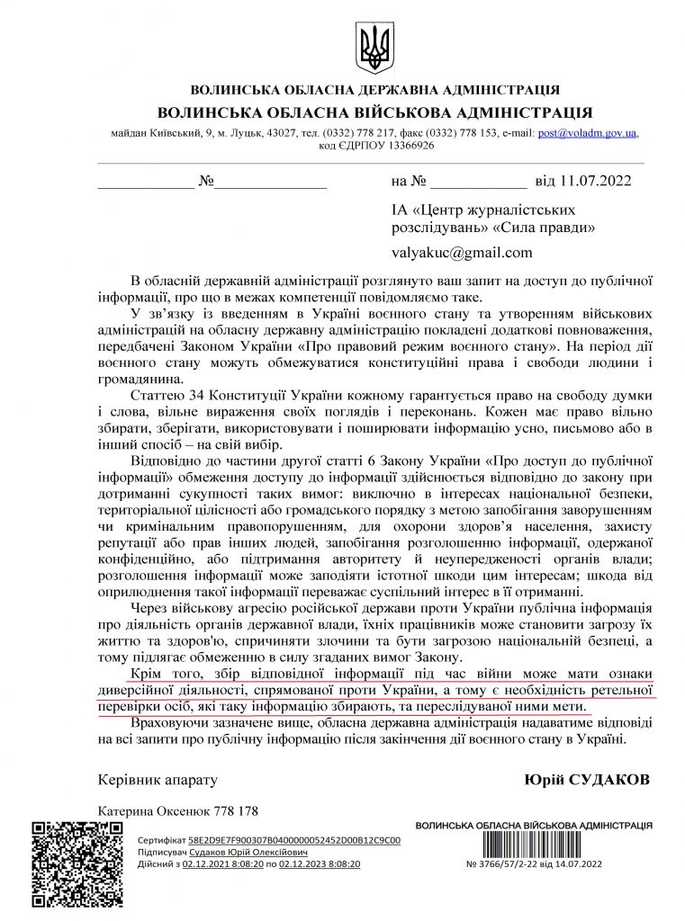 В обласній військовій адміністрації на запитання щодо передачі авто для ЗСУ відреагували дивно – написали, що збір такої інформації може мати ознаки диверсійної діяльності і пообіцяли, що всі відповіді на запити даватимуть після закінчення воєнного стану. Таку відповідь підписав сам керівник апарату Волинської ОВА Юрій Судаков.
