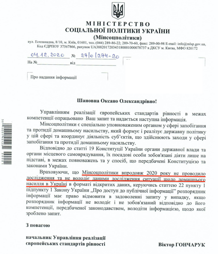 З року в рік Міністерство соціальної політики заявляє про те, що кожна п’ята жінка в Україні потерпає від сімейного насильства. Однак, коли «Сила правди» надіслала інформаційний запит щодо даних, на основі котрих роблять такі висновки, то виявилось, що власного дослідження Мінсоцполітики не проводить. Там опираються виключно на дані Національної поліції.