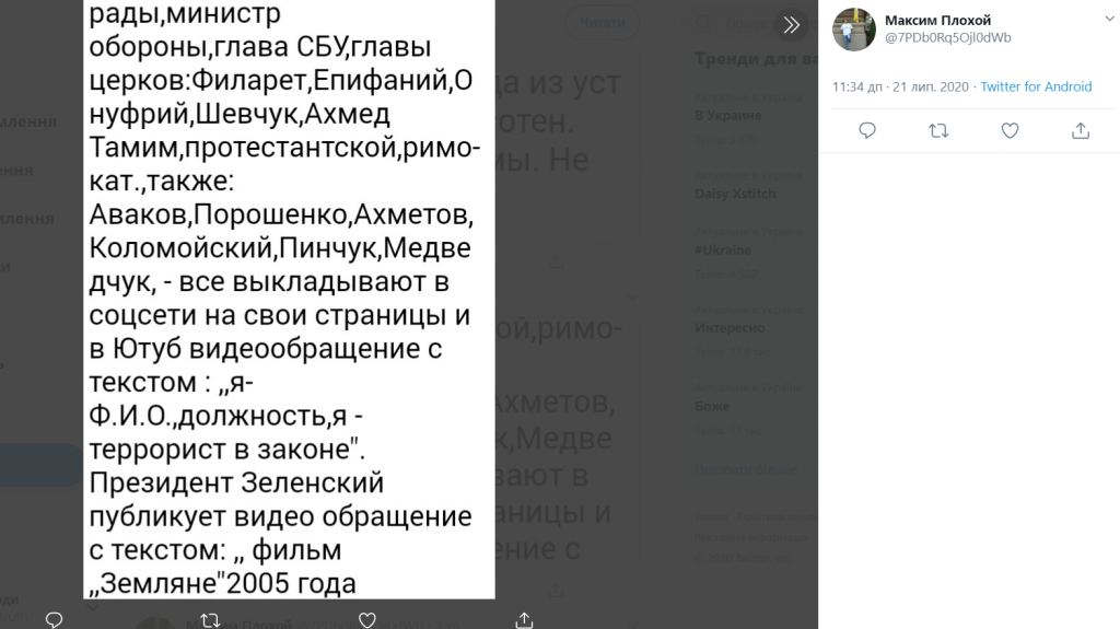 Він вимагає, аби глави судів, міністерств, прокуратури, парламенту, церков записали і виклали в YouTube заяви про те, що саме вони – терористи в законі.
