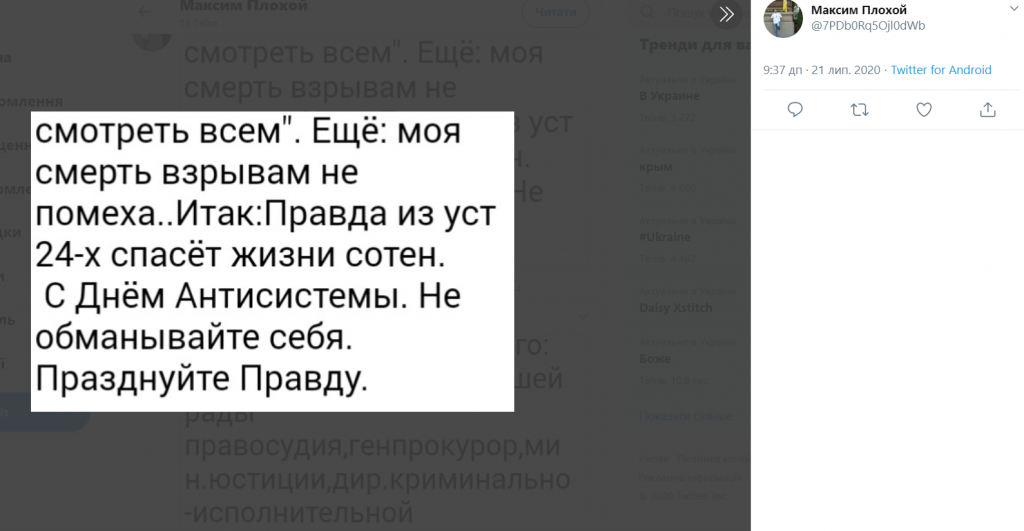 Журналісти знайшли свіжостворений профіль під іменем Максим Плохой у соцмережі Twitter. Там незадовго до захоплення автобусу чоловік опублікував посилання на відео зі свого каналу у YouTube із закликом ламати систему. Аналогічний ролик Плохой розмістив на своїй сторінці ВКонтакті ще кілька років тому. Зараз відео з обох ресурсів видалено, сторінки у соцмережах – заблоковані.